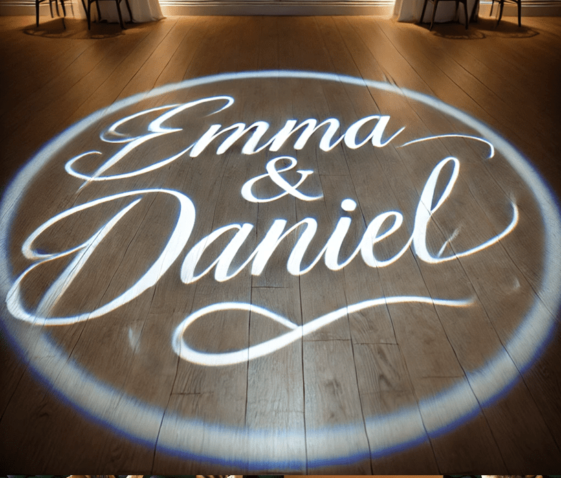 Add a unique and elegant touch to your event with our custom monogram projection service. This stunning effect displays your names or initials in a beautiful, glowing script on the dance floor, setting the perfect romantic atmosphere. Whether for your first dance, reception entrance, or the entire evening, this sophisticated lighting effect makes your event truly unforgettable.
